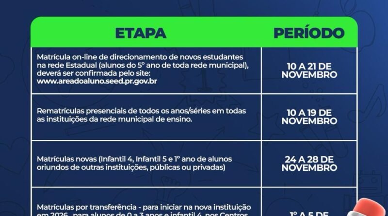 Read MoreA Prefeitura de Pato Branco, por meio da Secretaria Municipal de Educação e Cultura, divulga o cronograma de matrículas e
